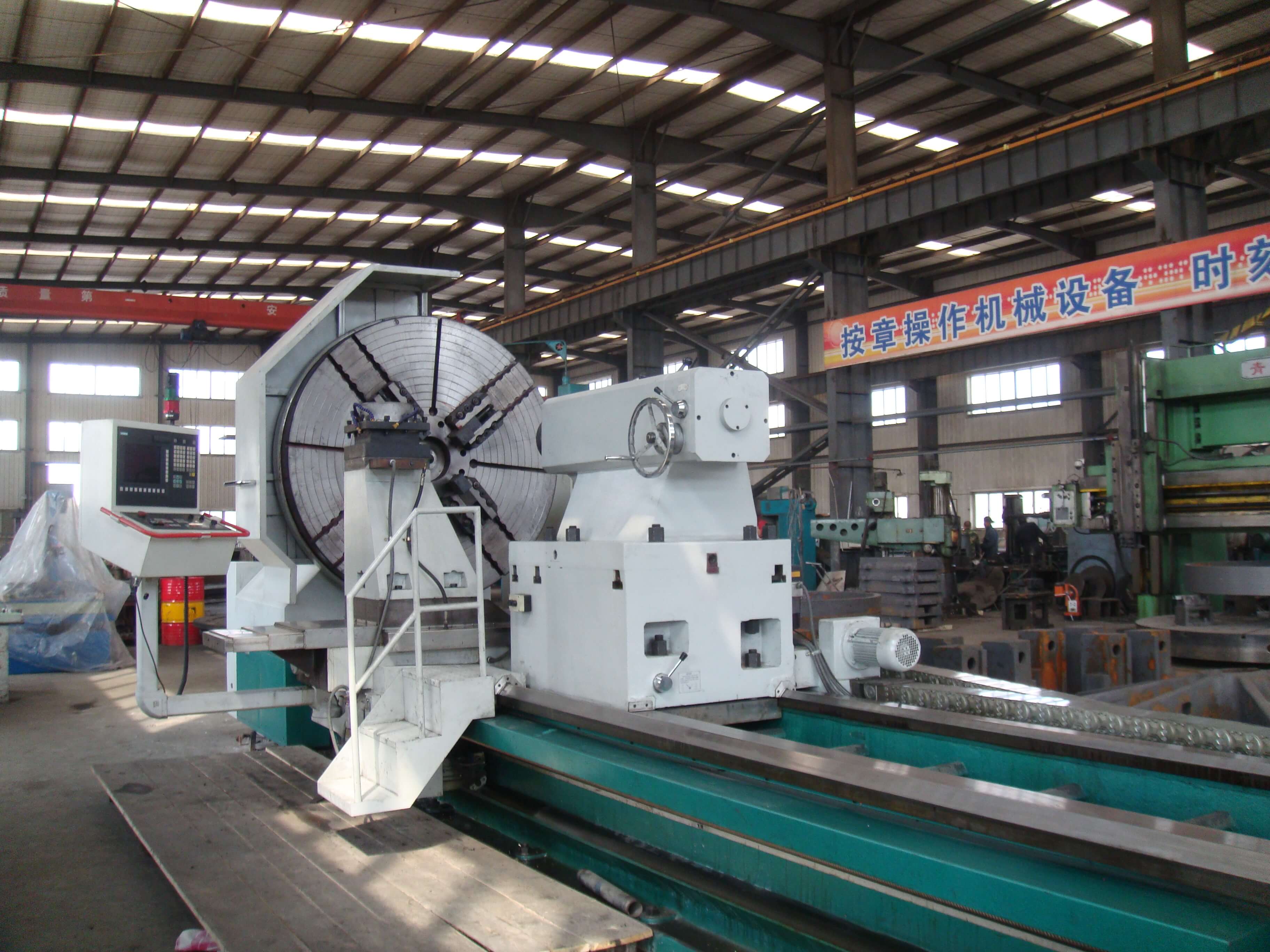 總建筑面積8290平方米,50t吊車2臺(tái),20t吊車1臺(tái),10t吊車5臺(tái)。擁有冷加工設(shè)備68臺(tái)套,包括TK6920-120-50重型數(shù)控落地銑鏜床,HC1200A臥式數(shù)控加工心,CKD61210/5000mm數(shù)控臥式車銑專機(jī)1臺(tái);12m×2.5m重型刨銑磨床1臺(tái);?200落地鏜床1臺(tái);TPX6113鏜床1臺(tái);T6111鏜床1臺(tái);立式車床4.0米、2.5米、1.25米、0.8米等10臺(tái);CAK系列數(shù)控車床6臺(tái)套;CW61100普車3臺(tái);CW6280B普車3臺(tái);滾齒機(jī)、插齒機(jī)、線切割、平面磨床等;